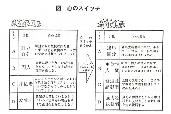 そのためには、まずチェンジ・エージェント自身が、「改革の鬼」として、その魂を伝播していくことは言うまでもない。また、それぞれのスイッチが切り替えやすいように、個々に働きかけが必要になります。