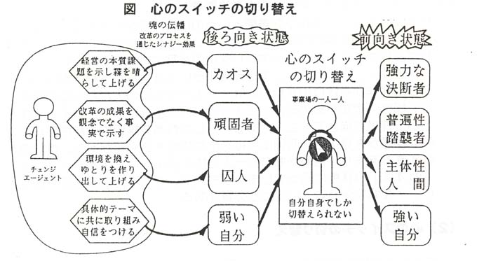 こうした意識の改革は、周りの人間から「あれこれ」言われて変わるものではなく、組織の一人ひとりが自分自身で切り替えない限り、変わるものではない。チェンジ・エージェントは、あらゆる改革のプロセスを通じて、こうした個々の人々の意識に影響を与え、それぞれの人たちが「心のスイッチを切り替える」ように働きかけていく必要がある。