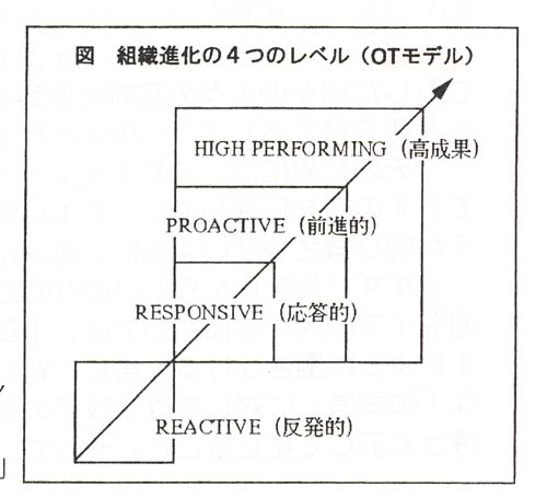 チェンジ・エージェントに求められるのは、個人の意識と同時に、組織の病の克服である。フランク・バーンズはこの組織の変革について、組織変革理論(OT;Organizational Transformation)を表わしている。彼は次の図のように組織は4つのレベルを経て進化をすることを述べている。最初のレベルは、「バラバラ(Fragment)」組織で各自が自分のことしか考えず罰則主義で動かすレベル。何事にも反発する。次に「封建的(Hierarchy)」組織で教育的なマニュアル主義や階級的な統制がはびこる。とりあえず言われたことには応える。そして、次に各自がそれぞれ次に何をするかという目標を管理する「目標管理型マトリクス(Matrix)」組織で、常に前向き意識に進化し始める。最後に最も組織としてパフォーマンスが高いレベルが「ネットワーク型(Network)」組織のレベルである。各自のメンバーは高い志と理想に燃え、積極的に組織に参加し、誰に命令されるわけでなく見ずから主体的に理想を実現しようとする自律的な組織である。