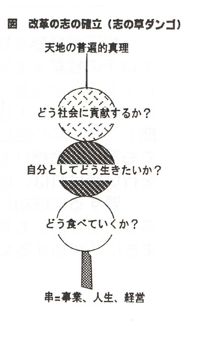 志とは、「(1)正しい目標をたてる(立志)(2)やろうという決意(志節)(3)やり続ける執念(志操)」を持つことである。そして寝ても覚めても常に、命懸けであること。そして「為すべきを為す」つまり、創意工夫を行い続ければ、改革の壁というものは必ず突き破ることが出来る。
